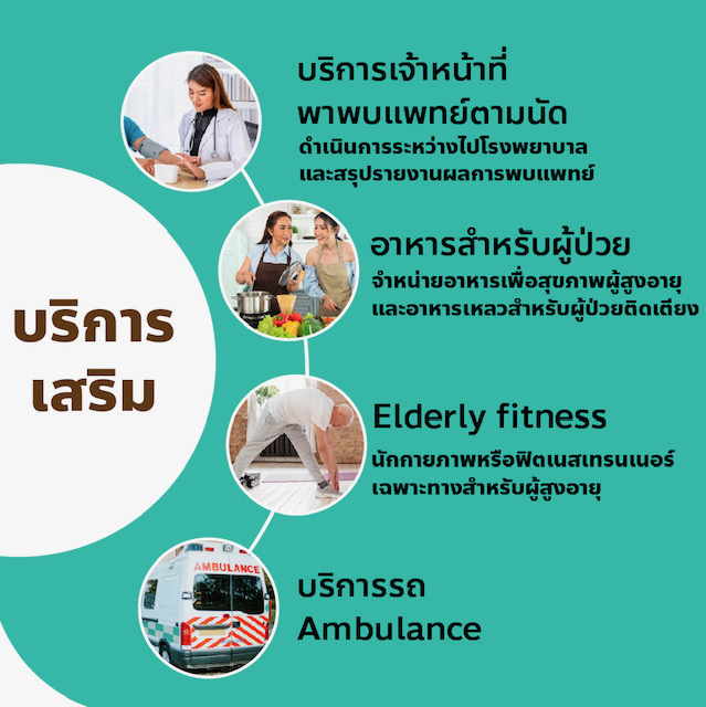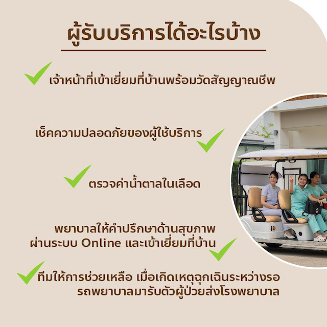 บริการดังกล่าว เริ่มตั้งแต่วางระบบการดูแลและให้คำปรึกษาด้านสุขภาพจากพยาบาลวิชาชีพ เจ้าหน้าที่เข้าเยี่ยมที่บ้านตรวจเช็คสัญญาณชีพ ตรวจสอบการทานยาแก่ผู้สูงอายุและผู้ป่วย บริการตรวจสุขภาพ โดยผู้เชี่ยวชาญสำหรับผู้สูงอายุ รวมถึงทีมให้การช่วยเหลือเมื่อเกิดเหตุฉุกเฉิน
