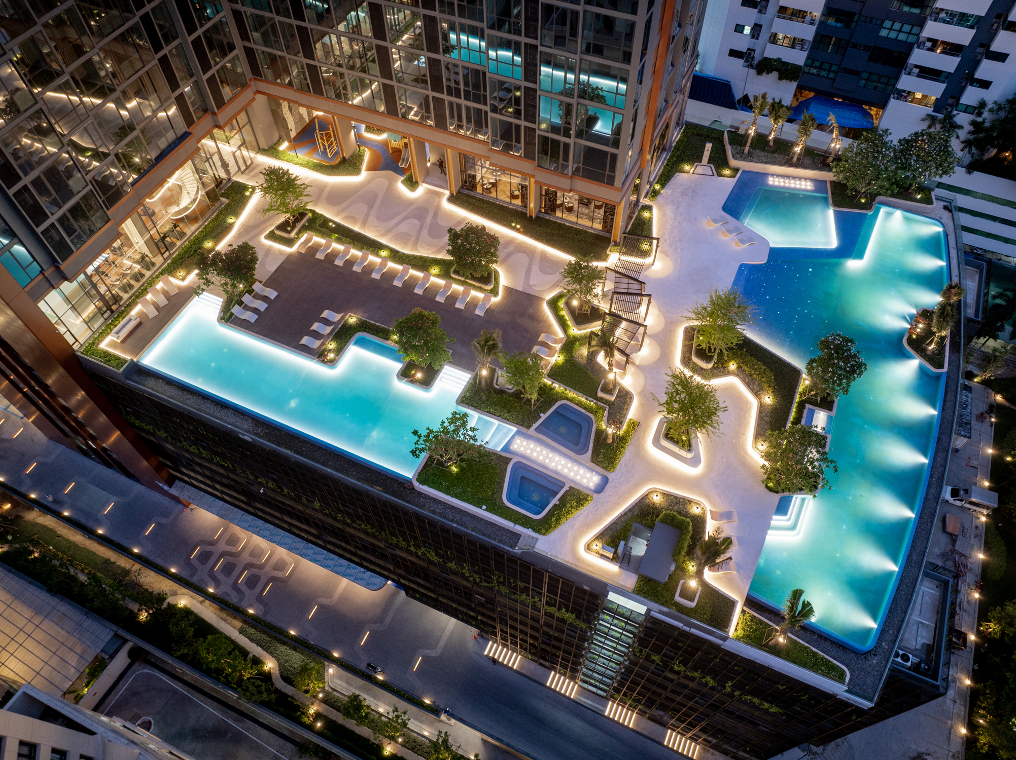 การออกแบบภายนอกอาคาร ยอดอาคารโค้งที่สอดคล้องกับสุริยันจันทราและสายรุ้ง การตกแต่งภูมิทัศน์ที่เน้นความเป็นธรรมชาติ และเส้นสายลวดลายแบบออสเตรเลีย รายล้อมด้วยสวนแสนรื่นรมย์ Forest Garden, Green Vertical Wall, Pool Deck