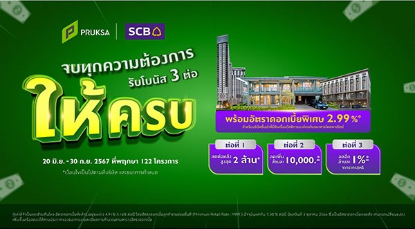 ผู้สนใจดูรายละเอียดเกี่ยวกับแคมเปญและรายชื่อโครงการที่เข้าร่วมแคมเปญได้ที่ https://www.pruksa.com/c/scb-x-pruksa หรือโทร.1739
