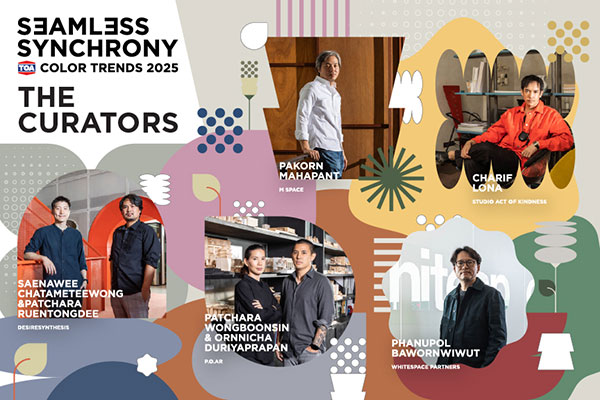 TOA ได้รับแรงบันดาลใจในการสร้างสรรค์เทรนด์สีจากสถาปนิก นักออกแบบชั้นนำของไทย ในการคิดค้นเทรนด์สีใหม่ 2025 เพื่อคนรักบ้านและที่อยู่อาศัย สอดรับกับเทรนด์รักษ์โลกอย่างยั่งยืน ประกอบด้วย คุณเศณวี ชาตะเมธีวงศ์ - คุณพชร เรือนทองดี DIRECTOR & CO-FOUNDER จาก DesireSynthesis คุณภากร มหพันธ์ ARCHITECT DESIGN DIRECTOR จาก M Space คุณพัชระ วงศ์บุญสิน - คุณอรณิชา ดุริยะประพันธ์ ARCHITECT & CO-FOUNDER จาก P.O.AR คุณชารีฟ ลอนา DESIGN DIRECTOR / FOUNDER จาก Studio Act of Kindness และ คุณภาณุภณ บวรวิวุฒิ DESIGN DIRECTOR จาก Whitespace