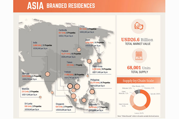 ประเทศไทยครองตำแหน่งผู้นำในเอเชียในตลาดที่พักอาศัยแบรนด์หรู (ในแง่มูลค่า) ตามมาด้วยฟิลิปปินส์และเกาหลีใต้ อย่างไรก็ตาม เวียดนามครองอันดับหนึ่งในด้านจำนวนโครงการใหม่ที่อยู่ระหว่างการพัฒนา สำหรับระดับเมือง ภูเก็ตก้าวขึ้นเป็นผู้นำตลาด ตามมาด้วยมะนิลาและกรุงเทพฯ