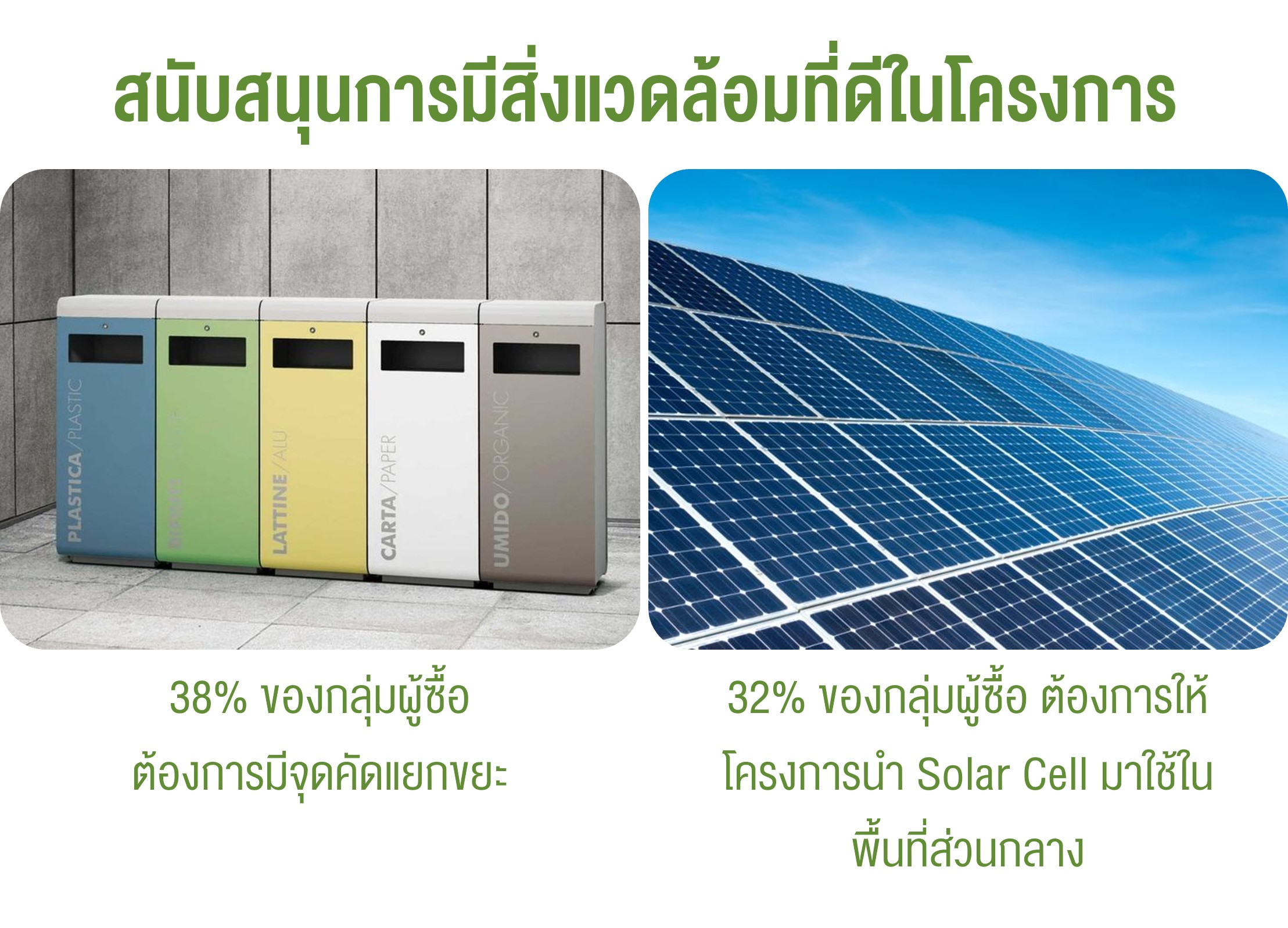 จากการสำรวจของ LWS เมื่อเดือนตุลาคม 2567 จากจำนวนผู้ตอบแบบสอบถาม 670 คน พบว่า ผู้สนใจซื้ออาคารชุดให้ความสำคัญกับสิ่งแวดล้อม โดยแบ่งเป็นกิจกรรมที่อยากให้มีในโครงการคือ 38% ของผู้ตอบแบบสอบถามต้องการให้มีการคัดแยกขยะ ถัดมา 32% ต้องการให้โครงการใช้พลังงานไฟฟ้าจาก Solar Cell เข้ามาทดแทนการไฟฟ้าในพื้นที่ส่วนกลาง และทุกกิจกรรมที่กล่าวมา เป็นการก้าวไปสู่เป้าหมาย Net Zero ในปี พ.ศ. 2608