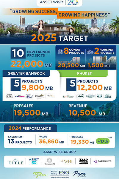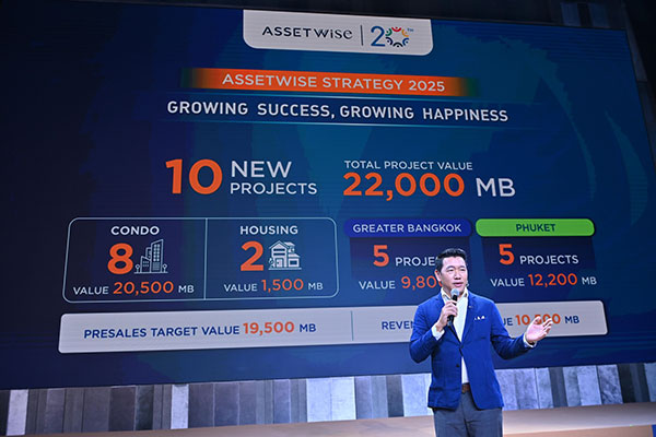 ด้านเป้าหมายยอดขายและรายได้ในปี 2568 บริษัทตั้งเป้าหมายยอดขายอยู่ที่ 19,500 ล้านบาท และเป้าหมายรายได้ 10,500 ล้านบาท เติบโต 20% จากปี 2567 ขณะเดียวกัน แอสเซทไวส์ยังมีโครงการสร้างเสร็จใหม่พร้อมโอนกรรมสิทธิ์ในปี 2568 ซึ่งเป็นโครงการคอนโดมิเนียมทั้งหมด 7 โครงการ มูลค่ารวม 14,050 ล้านบาท และปัจจุบันบริษัทมียอดขายรอรับรู้รายได้ (Backlog) สิ้นปี 2567 มูลค่ารวมกว่า 25,200 ล้านบาท แบ่งสัดส่วนเป็นโครงการในกรุงเทพฯ ปริมณฑล จำนวน 12,600 ล้านบาท โครงการในทำเล EEC จำนวน 2,700 ล้านบาท และโครงการในภูเก็ตอีกกว่า 9,900 ล้านบาท ซึ่งจะทยอยรับรู้รายได้สร้างความแข็งแกร่งให้บริษัทอย่างต่อเนื่องจนถึงปี 2570