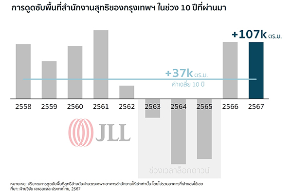 พื้นที่สำนักงานใหม่ในกรุงเทพฯ ส่วนใหญ่เป็นพื้นที่ระดับพรีเมียมในโครงการมิกซ์ยูส ในขณะที่อาคารเก่าหลายแห่งถูกปรับเปลี่ยนหรือพัฒนาใหม่เป็นพื้นที่ทำงานแบบอเนกประสงค์มากขึ้น นอกจากนี้ ในย่านศูนย์กลางธุรกิจพื้นที่สำนักงานเกรด A+ มีอัตราการเติบโตเฉลี่ยต่อปี (CAGR) ในช่วง 5 ปีที่ผ่านมาสูงถึง 3.7% ซึ่งสูงกว่าอัตราการเติบโตของค่าเช่าทั้งตลาดที่อยู่ที่ 1.0%
