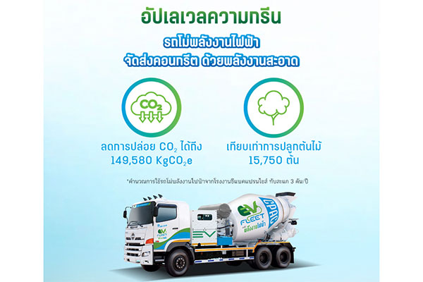 ล่าสุด “โรงงานซีแพคแฟรนไชส์ทับสะแก จ.ประจวบคีรีขันธ์” โดย “บริษัท ว.บัญชา คอนสตรัคชั่น จำกัด” คู่ธุรกิจ ได้นำร่องใช้รถโม่พลังงานไฟฟ้า CPAC EV Mixer Truck เป็นรายแรก ในการจัดส่งคอนกรีตให้ลูกค้า ถือเป็นจุดเริ่มต้นของการ “เปลี่ยน” เพื่ออนาคต ด้วยการบริหารการลดต้นทุนเชื้อเพลิง และตระหนักถึงการช่วยลดผลกระทบต่อสิ่งแวดล้อม ในฐานะของ CPAC มีความรู้สึกยินดีที่คู่ธุรกิจแฟรนไชส์มองเป้าหมายเดียวกัน คือการเดินหน้าสู่สังคมคาร์บอนต่ำด้วยการใส่ใจต่อสินค้า และบริการที่เป็นมิตรต่อสิ่งแวดล้อม ตั้งแต่กระบวนการผลิตไปจนถึงการขนส่ง และการเลือกใช้รถโม่พลังงานไฟฟ้าที่มีระบบการขับเคลื่อนที่เงียบ ช่วยลดมลพิษ ไม่ได้มีข้อดีแค่ผู้ประกอบการและโลกเท่านั้น แต่ยังทำให้คุณภาพชีวิตของประชาชนดีขึ้นด้วย ซึ่งการทำงานร่วมกันในครั้งนี้สามารถลดการปล่อยก๊าซคาร์บอนไดออกไซด์ (CO2) ลงได้ 149,580 KgCO2e เทียบเท่าการปลูกต้นไม้ 15,750 ต้น *คำนวณการใช้รถโม่พลังงานไฟฟ้าจากโรงงานซีแพคแฟรนไชส์ทับสะแก 3 คัน/ปี