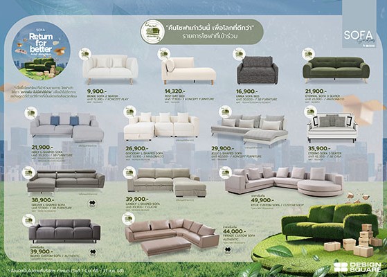 ใครที่กำลังมองหาโซฟาใหม่ ทางเรามีโซฟา 13 รุ่นที่อยากแนะนำ ซึ่่งใน 13 รุ่นนี้จะมีสัญลักษณ์ "คืนวันนี้ เพื่อโลกที่ดีกว่า" กำกับไว้อย่างชัดเจน และยังเป็นรุ่นที่เข้าร่วมแคมเปญ "Return for Better" โดยจะได้รับบริการติดตั้งโซฟาใหม่โดยช่างมืออาชีพแบบครบวงจร พร้อมรับโซฟาเก่ากลับฟรีถึงบ้าน