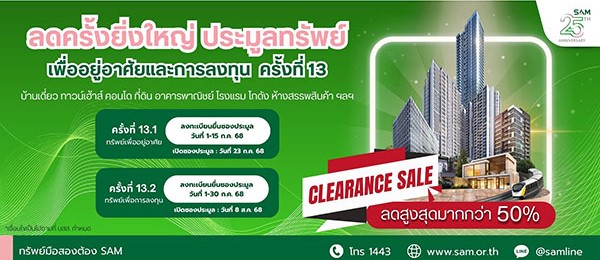 ทั้งนี้ ผู้สนใจเข้าร่วมประมูลสามารถลงทะเบียนและยื่นซองประมูล พร้อมเอกสารประกอบการประมูลที่กำหนด โดยทรัพย์เพื่อที่อยู่อาศัยและเพื่อการลงทุน ราคาไม่เกิน 20 ลบ. (ครั้งที่ 13.1/2568) ภายในวันที่ 15 ก.ค. 2568 และ กำหนดเปิดซองประมูลวันที่ 23 ก.ค. 2568 และทรัพย์ที่มีราคาสูงกว่า 20 ลบ. (ครั้งที่ 13.2/2568) ภายในวันที่ 30 ก.ค. 2568 และกำหนดเปิดซองประมูลวันที่ 8 ส.ค. 2568 เวลา 10.00 น. เป็นต้นไป ที่สำนักงานใหญ่ SAM อาคารซันทาวเวอร์ส ถ.วิภาวดีรังสิต กรุงเทพฯ หรือสอบถามรายละเอียดเพิ่มเติมได้ที่ Call Center 1443 และดูรายละเอียดทรัพย์สินได้ทางเว็บไซต์ที่ www.sam.or.th รวมทั้งช่องทางออนไลน์ที่หลากหลายและสะดวกรวดเร็ว โดยแอด ID Line @Samline ติดตาม Facebook Fanpage ทรัพย์มือสองต้อง SAM หรือ SAM NPA Channel บน YouTube เพื่อติดตามข้อมูลข่าวสารดี ๆ จาก SAM