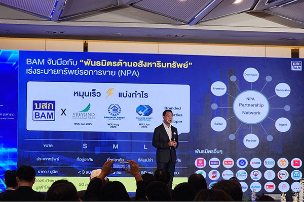 ขณะที่การบริหารจัดการทรัพย์สินรอการขาย หรือ NPA เดินหน้ากลยุทธ์พันธมิตรทางธุรกิจ (NPA Partnership) ซึ่งเป็นกลยุทธ์สำคัญที่มุ่งขยายฐานธุรกิจและสร้างรายได้เพิ่มขึ้น ผ่านความร่วมมือกับบริษัทพันธมิตรที่มีศักยภาพ อาทิ บริษัทอสังหาริมทรัพย์ ได้แก่ บริษัท วี บียอนด์ ดีเวลอปเม้นท์ จำกัด (มหาชน) บริษัท ไซมิส แอสเสท จำกัด (มหาชน) และบริษัท บางกอก แอสเซท อินเตอร์กรุ๊ป จำกัด (มหาชน) และสถาบันการเงิน เช่น ธนาคารยูโอบี ธนาคารกรุงเทพ ธนาคารอาคารสงเคราะห์ โดย BAM มุ่งเน้นการคัดสรรและนำเสนอทรัพย์ NPA ขนาด Big Lots ให้พันธมิตรนำไปพัฒนาและเพิ่มมูลค่า ทั้งบ้านเดี่ยว อาคารพาณิชย์ คอนโดมิเนียม และที่ดินเปล่า เพื่อพลิก “ทรัพย์ร้าง” ให้กลายเป็น “ทรัพย์สร้างกำไร” ต่อยอดเป็นทรัพย์สินที่สร้างรายได้ให้กับ BAM อย่างต่อเนื่อง ลดระยะเวลาการถือครอง และสร้างผลตอบแทนที่สูงขึ้นในระยะยาว โดย BAM สามารถสร้างยอดขายจากการจำหน่ายทรัพย์แปลงใหญ่ได้ถึง 1,450 ล้านบาท ซึ่งทรัพย์ดังกล่าวเป็นที่ดินเปล่าจำนวน 50 แปลง ตั้งอยู่ที่อำเภอเมืองเชียงใหม่ จังหวัดเชียงใหม่ เนื้อที่รวม 26-3-37.40 ไร่