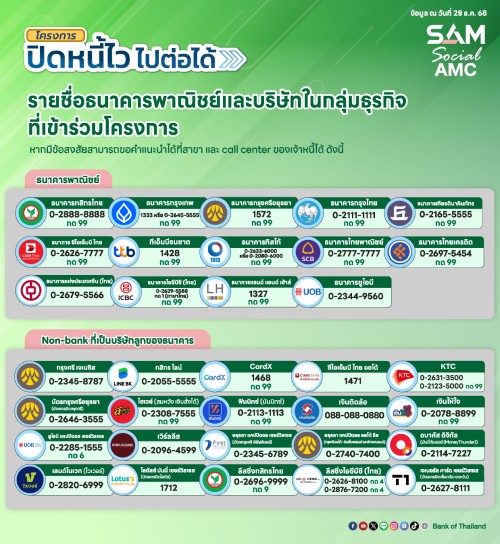 ผู้สนใจสามารถติดตามข่าวสาร หรือสอบถามข้อมูลรายละเอียดเพิ่มเติมได้ที่ SAM Contact Center 1443 กด 6 และ Line: @samsocialamc รวมถึงช่องทาง BOT Contact Center 1213 และสถาบันการเงินเจ้าหนี้เดิมของลูกหนี้